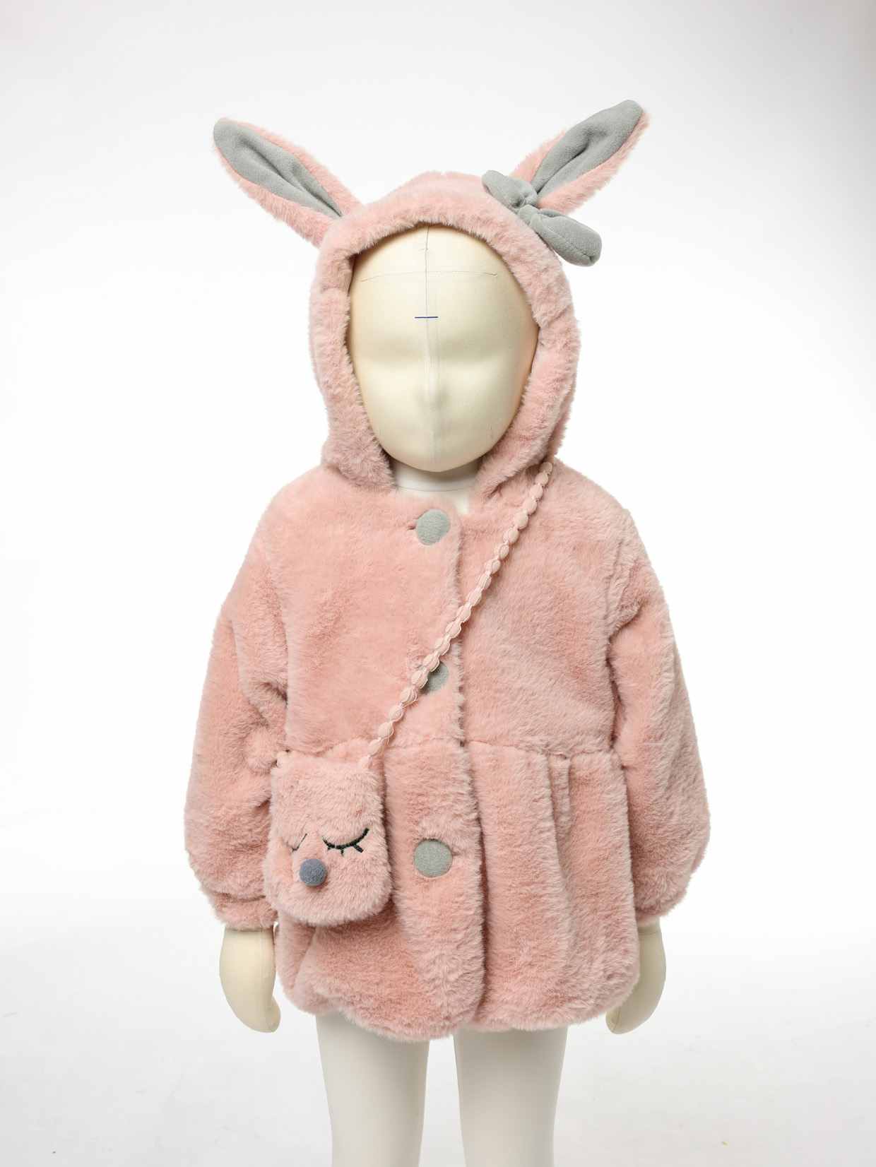 1. Rabbit-Themed Kids Hooded Jacket Design: The hood features long gray-lined ears and a matching bow, paired with a detachable rabbit-shaped crossbody pouch — turning this kids hooded jacket into an interactive, baby-approved piece, while the enclosed hood provides the snug coverage typical of a toddler winter coat.