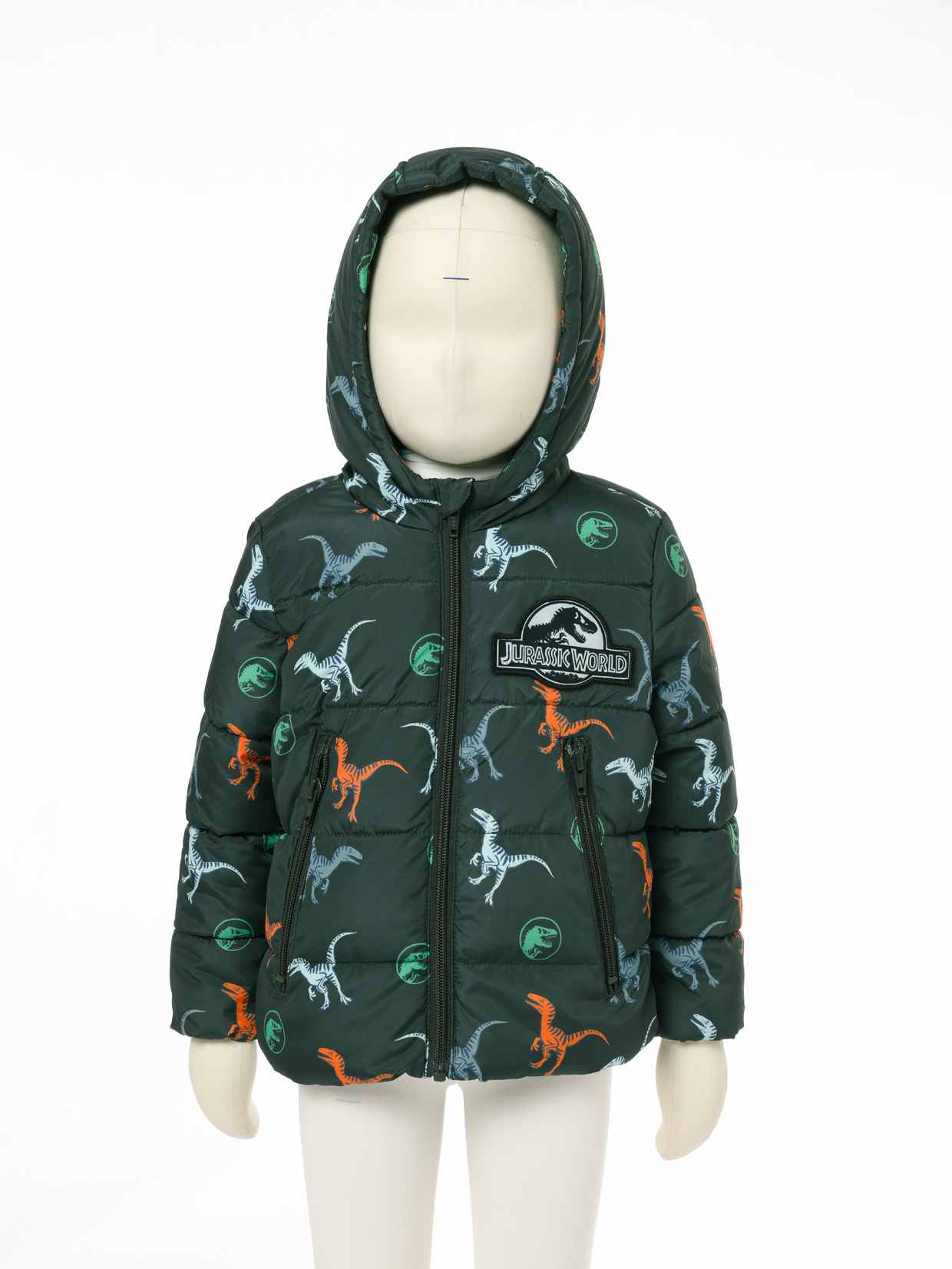 1. Jurassic World Themed Print: Vibrant dinosaur + logo accents make this kids winter jacket a standout piece boys will be excited to wear, pairing perfectly with the playful vibe of a warm jacket for boys.