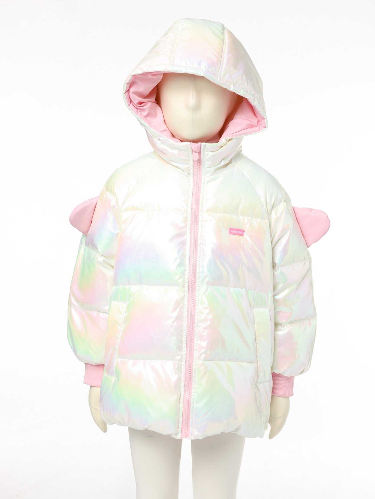 1. Iridescent Fabric + Wing Accents: The dreamy rainbow sheen paired with pink shoulder wings turns this girls winter jacket into a standout piece that pairs seamlessly with everyday outfits.
