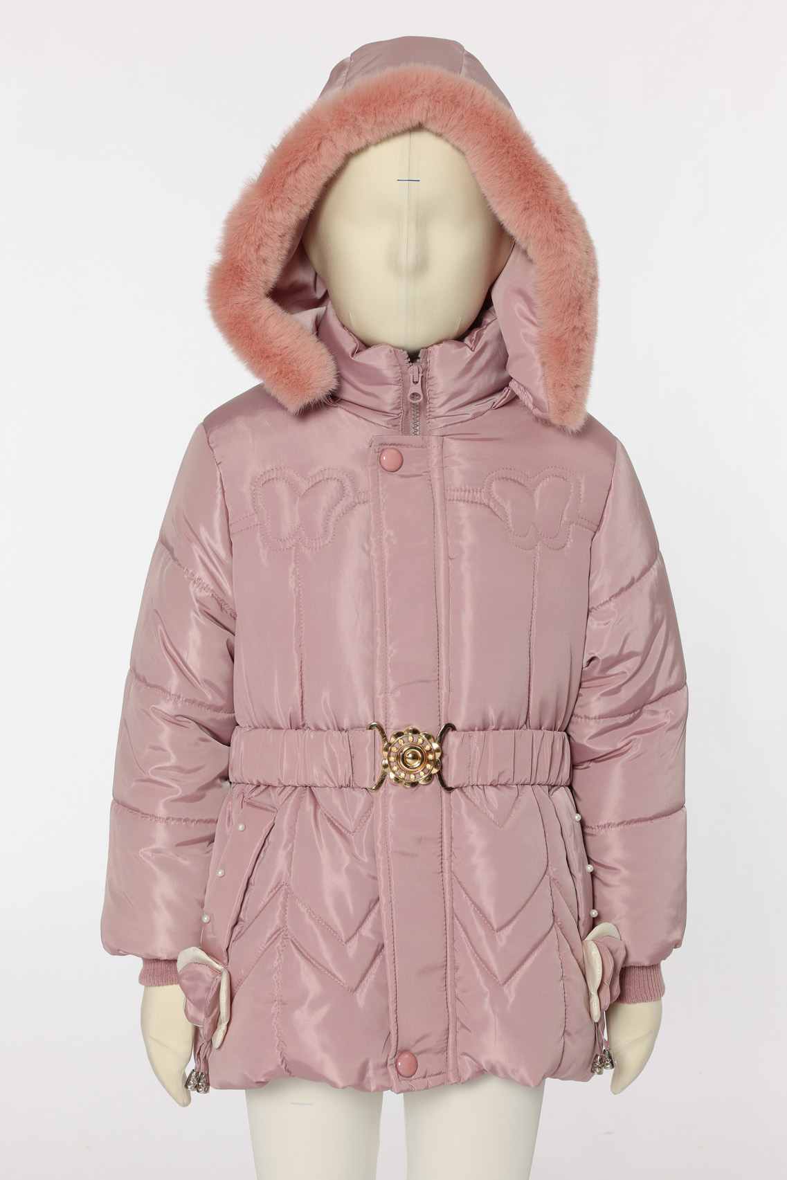 4. Pearl & Butterfly Accents: Side pearl details and 3D butterfly charms add whimsy and delicacy, turning this kids winter jacket into a fun, eye-catching piece.