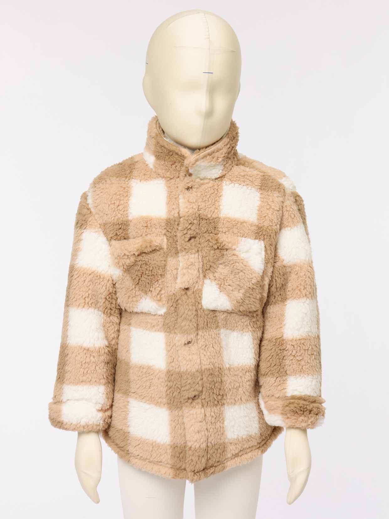 1. Plush Checkered Fabric: The soft, brown-and-white checkered texture works as both a laid-back Girl winter shirt and a warm warm jacket for girls, balancing style and comfort.